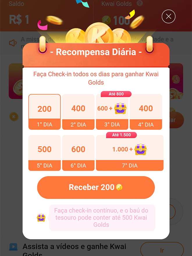 Além das tarefas envolvendo o convite de novas pessoas, é possível adquirir Kwai Golds após realizar check-ins diários na plataforma. Basta apenas acessar o aplicativo por sete dias consecutivos para receber recompensas progressivas em moedas. Alguns check-ins disponibilizam caixas de tesouro, que podem elevar a quantidade de moedas obtidas pelo acesso.