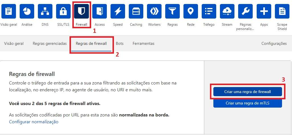 Porém caso queira bloquear algum país usando a Cloudflare, basta acessar o seu Painel de Controle, navegar até a aba Firewall e em seguida clicar em Regras de Firewall que você poderá começar a criar novas regras.