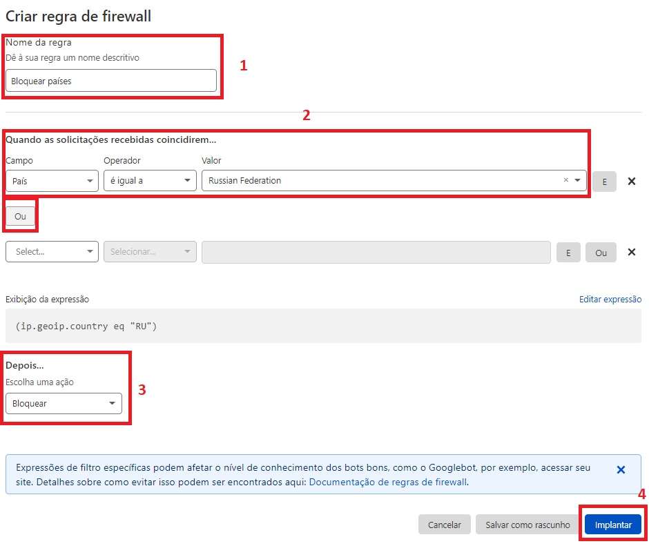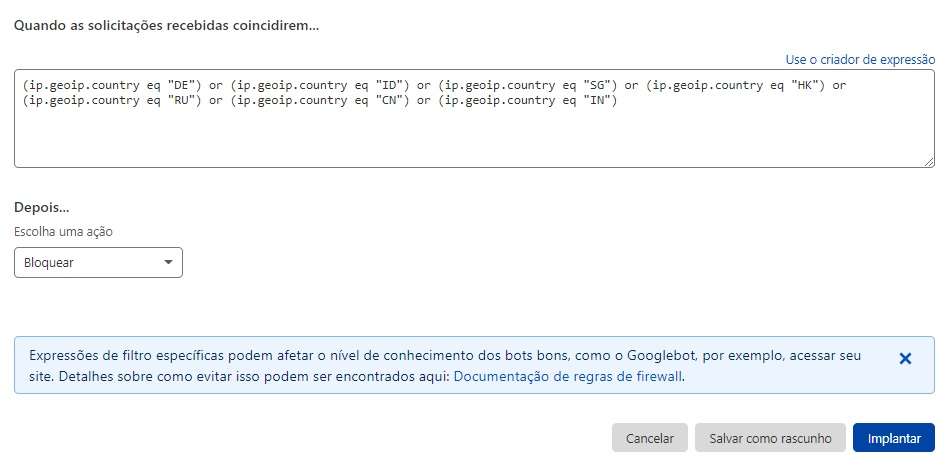 eito isso a Cloudflare irá passar a bloquear toda e qualquer tentativa de acesso provenientes dos países inseridos na regra, o que certamente vai diminuir e muito o número de tentativas de ataques.