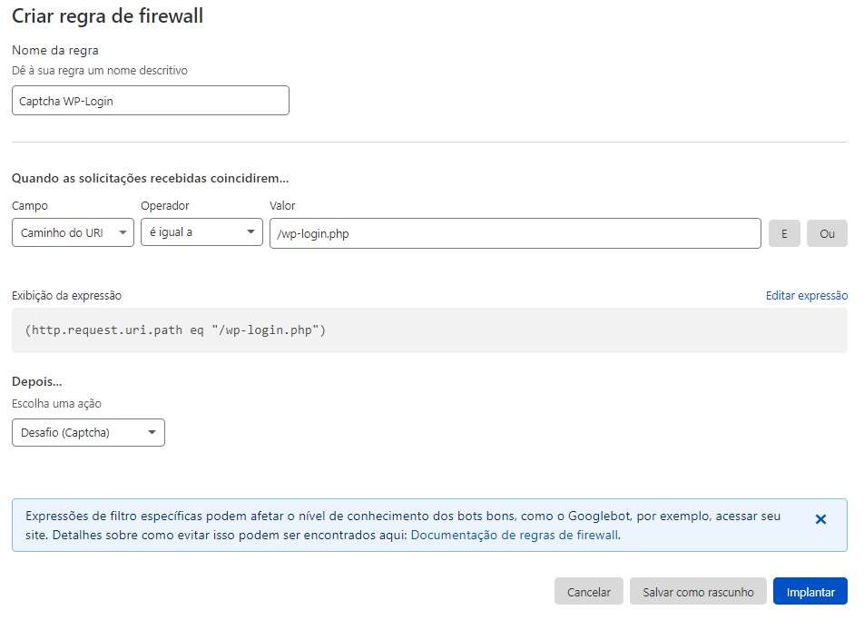 Essa técnica é excelente para evitar que bots realizem tentativas de ataque de força bruta a sua página do de login (wp-admin), configurando um captcha a Cloudflare começará a filtrar e a exibir desafios para todos os acessos a sua página wp-admin.