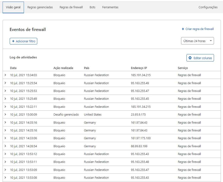 Você pode acompanhar os resultados dos bloqueios das regras configurados na aba “Visão Geral”, onde será possível ver qual regra foi ativada, origem do acesso, página e IP.