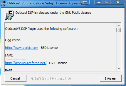 Após baixar o Oddcast V3 em seu computador, abra o arquivo ODDCast_V3.zip. Após isto, abra o arquivo 01 – ODDCast_V3_3.1.18.exe, e clique em “I Agree”: