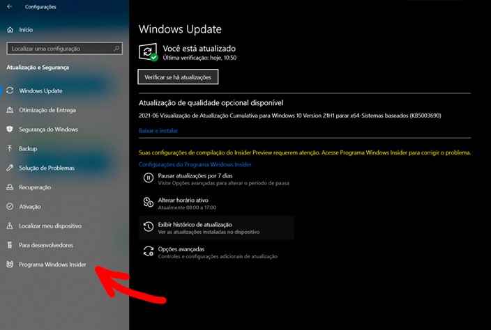 - Após escolher o canal, reinicie o computador, volte para a aba “Atualização e Segurança” e busque por atualizações. O download da nova build deve começar.