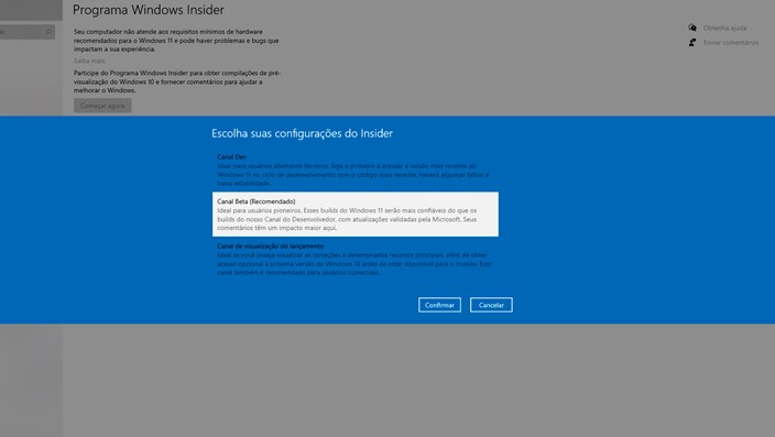 - Vincule sua conta registrada anteriormente no Windows Insider com o sistema e escolha o “Canal Beta”.